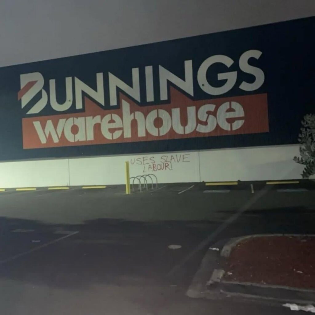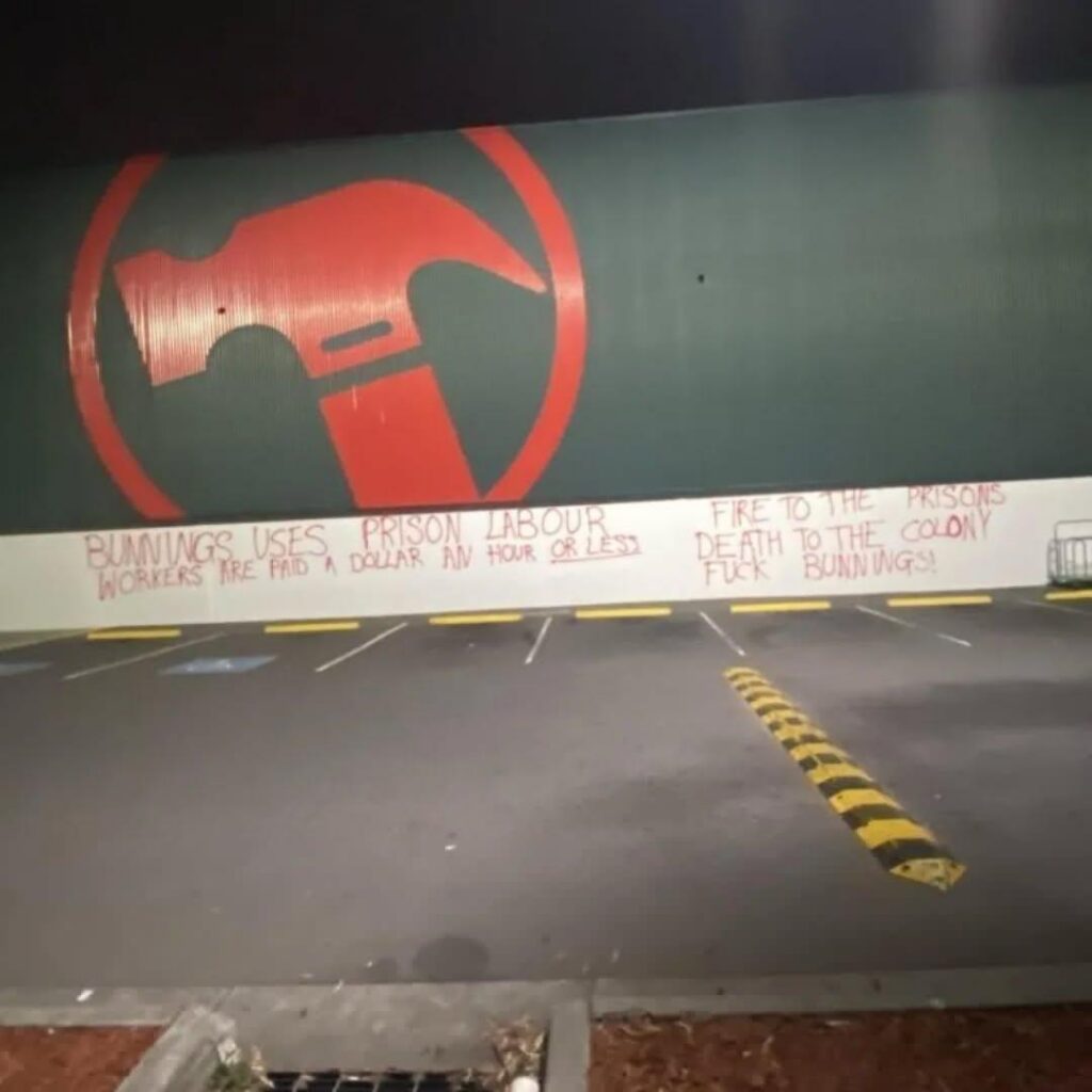 “Bunnings warehouse targeted with graffiti: Bunnings uses slave and prison labour – workers are paid a dollar an hour or less! Fire to the prisons. Death to the colony. Fuck Bunnings!”