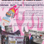 TRANS LIBERATION COUNTER PROTEST april 26 2025 – 11:30am – ‘victorian’ parliament spring street DROWN OUT THE TERFASCISTS! bring: friends, noisemakers, masks, snacks, water terf and white nationalist networks are mobilising again for a reactionary WOMEN WILL SPEAK rally at ‘victorian’ parliament. we reject their oppresive ideology. we are taking to the streets to drown […]